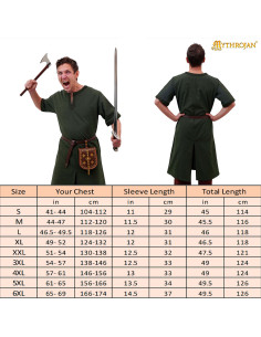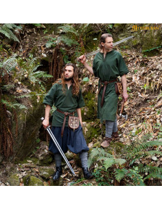 La cintura in pelle marrone inclusa non solo regola la tunica alla perfezione, ma aggiunge anche un elemento visivo equilibrato, completando il verde scuro del tessuto. Potrai abbinarla facilmente a mantelli, armature o qualsiasi accessorio che esalti il tuo personaggio storico, che sia un guerriero vichingo, un anglosassone o una figura medievale.