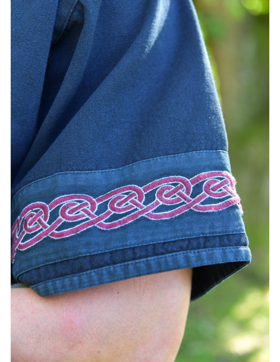 Il suo collo a forma di 'V' con apertura, decorato con trame in tonalità rosso e grigio scuro, conferisce un tocco elegante senza perdere quell'essenza guerriera. La lavorazione artigianale nei dettagli, come le cuciture di riparazione sul colletto e sull'orlo, riflette la sua natura resistente. Le maniche corte e larghe, adornate con motivi intrecciati ispirati alla cultura celtica, offrono libertà di movimento totale, ideale per reenactment, LARP o fiere medievali.