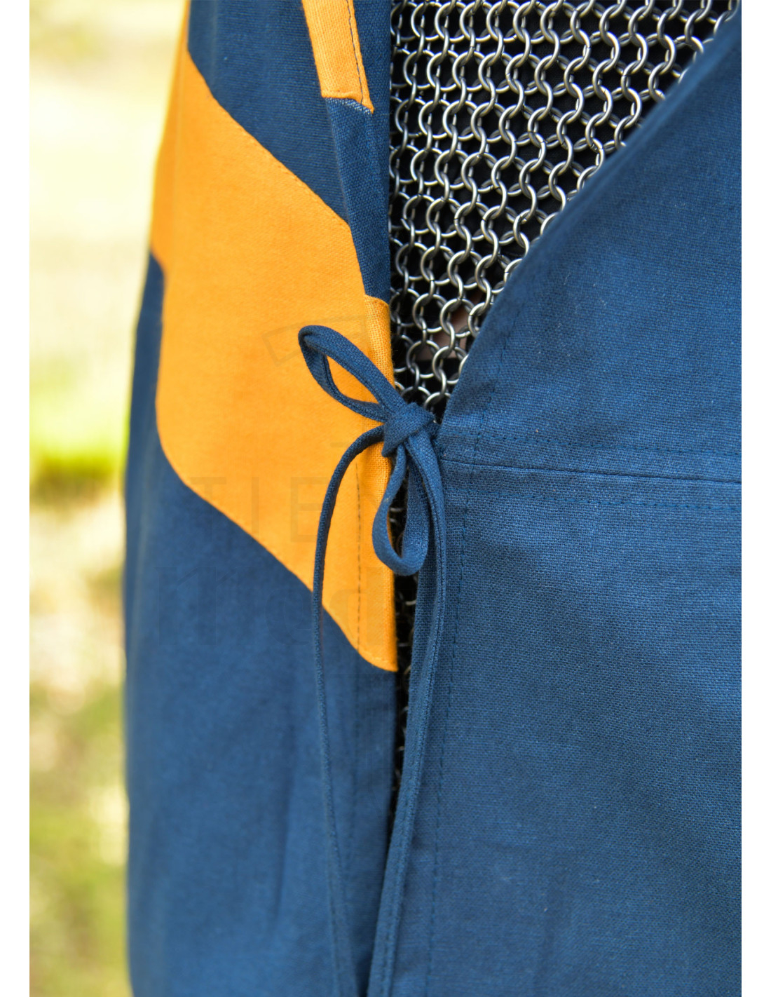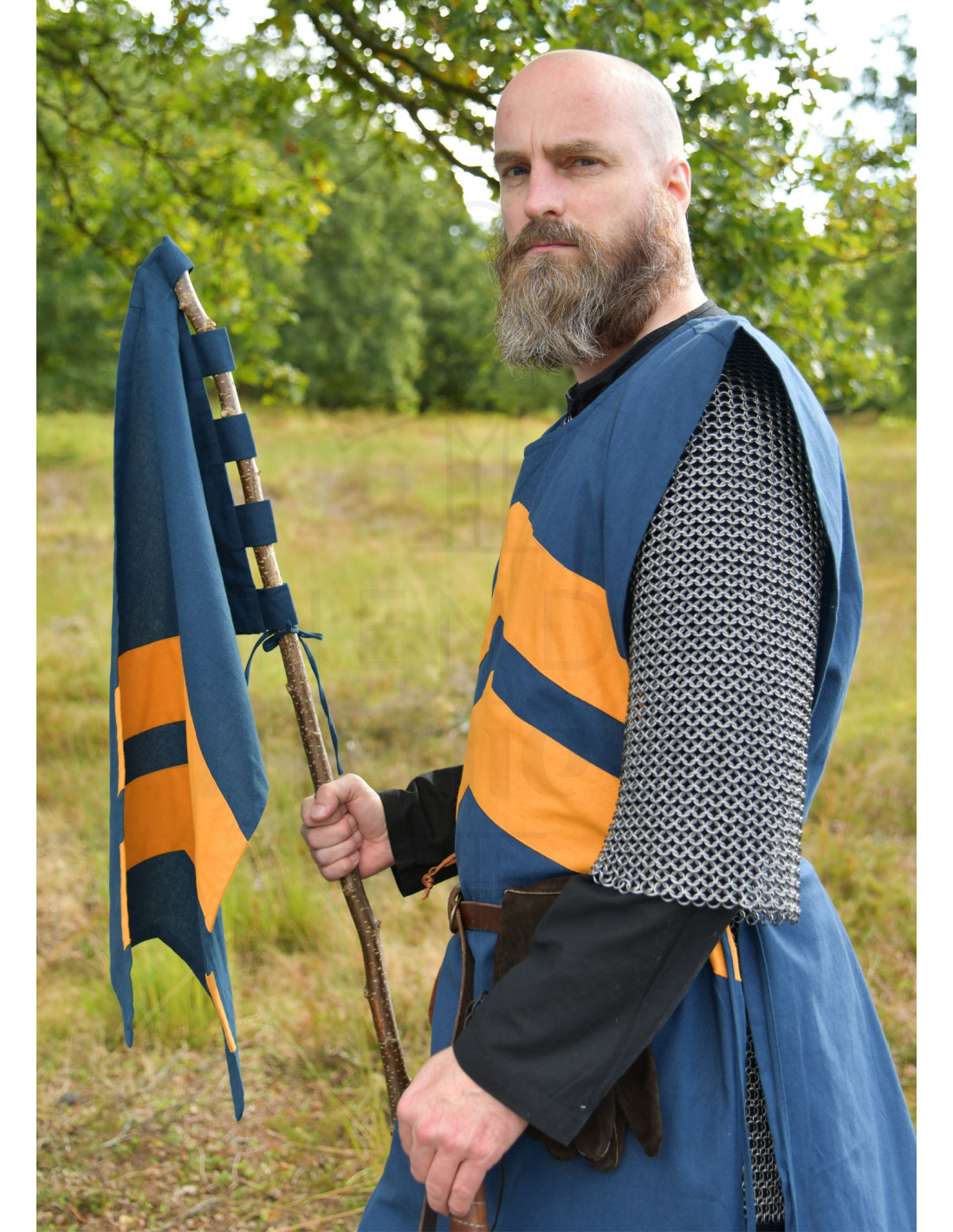 Vuoi distinguerti nella tua prossima rievocazione storica o evento medievale con un tocco autentico e accattivante? Questo design a righe blu e giallo attira gli sguardi e rende facile riconoscerti all’istante, sia in battaglie scenografate che in fiere e sessioni fotografiche.