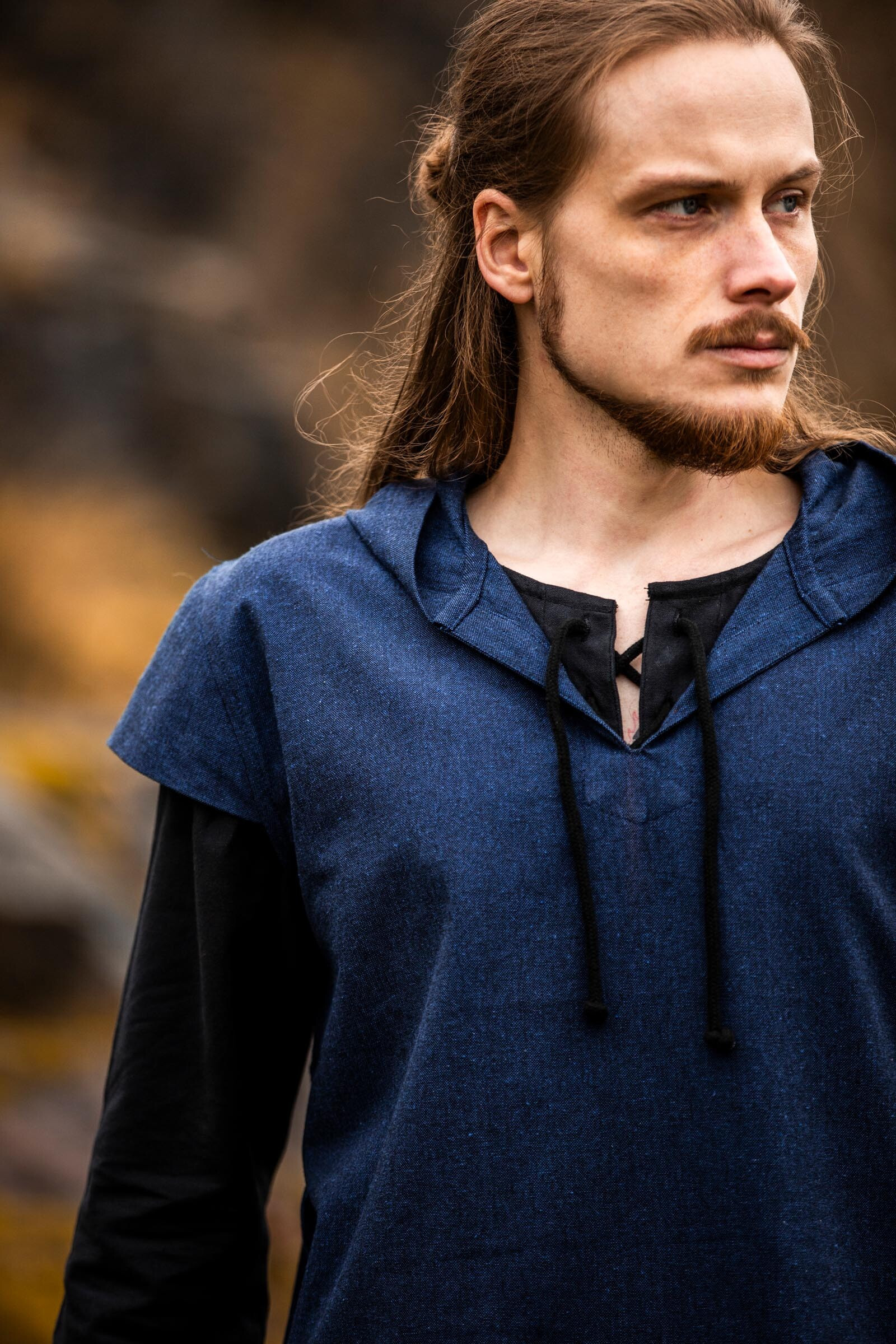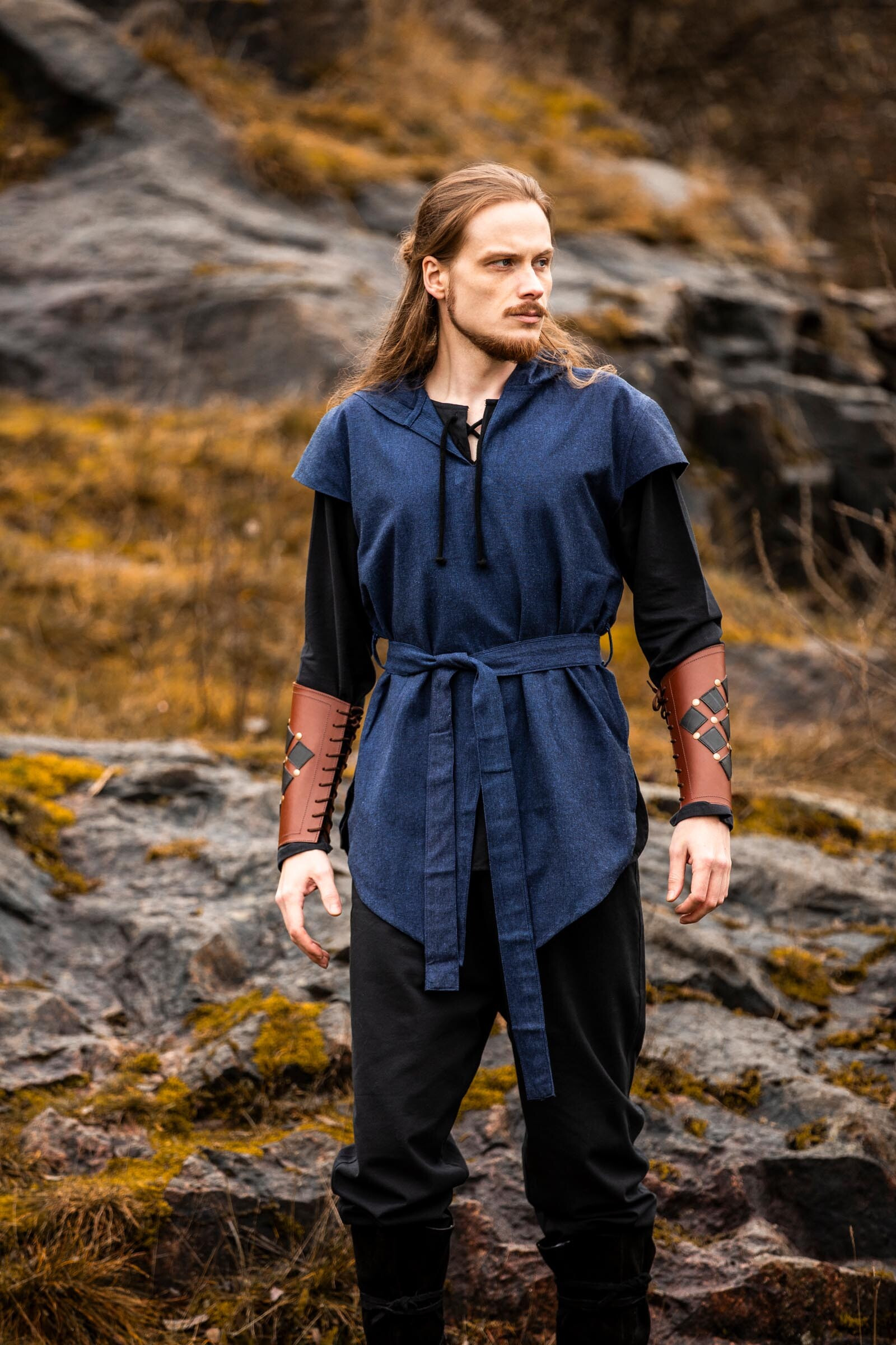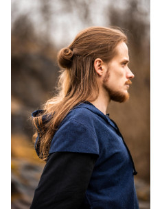 La Tunica medievale da arciere modello Arais, blu offre quella sensazione fin dal primo utilizzo: un cappuccio avvolgente che protegge senza limitare, e un scollo a V sovrapposto che aggiunge carattere senza complicare il movimento. Essendo senza maniche, consente movimenti liberi delle braccia, ideale per coloro che richiedono agilità e precisione in ciascun gesto.