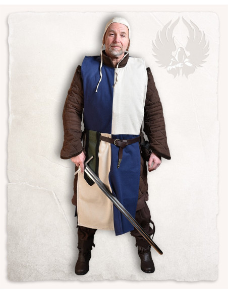 Il Tabardo medieval quadrato modello Antón, colore blu-bianco rende questa immagine realtà: un indumento di taglio dritto, comodo e facile da indossare, basta farlo scivolare sopra la testa e fissarlo con la tua cintura per indossarlo in pochi secondi. Grazie alla sua apertura laterale e alla regolazione tramite cintura, offre totale libertà di movimento, si adatta a strati di abbigliamento sotto di esso, e rimane al suo posto durante l'intera giornata.