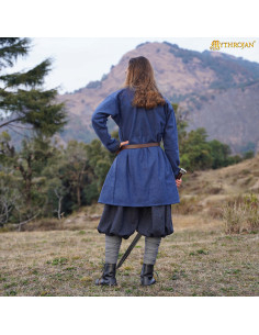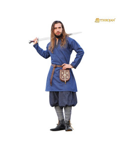 Il suo colore blu vibrante e i suoi dettagli curati, come i polsini in tono a contrasto e il design tradizionale del taglio, la rendono un pezzo versatile che puoi integrare in una vasta gamma di costumi medievali. E se cerchi di completare il look, abbina questa tunica a pantaloni larghi e stivali storici come quelli indossati dal modello.