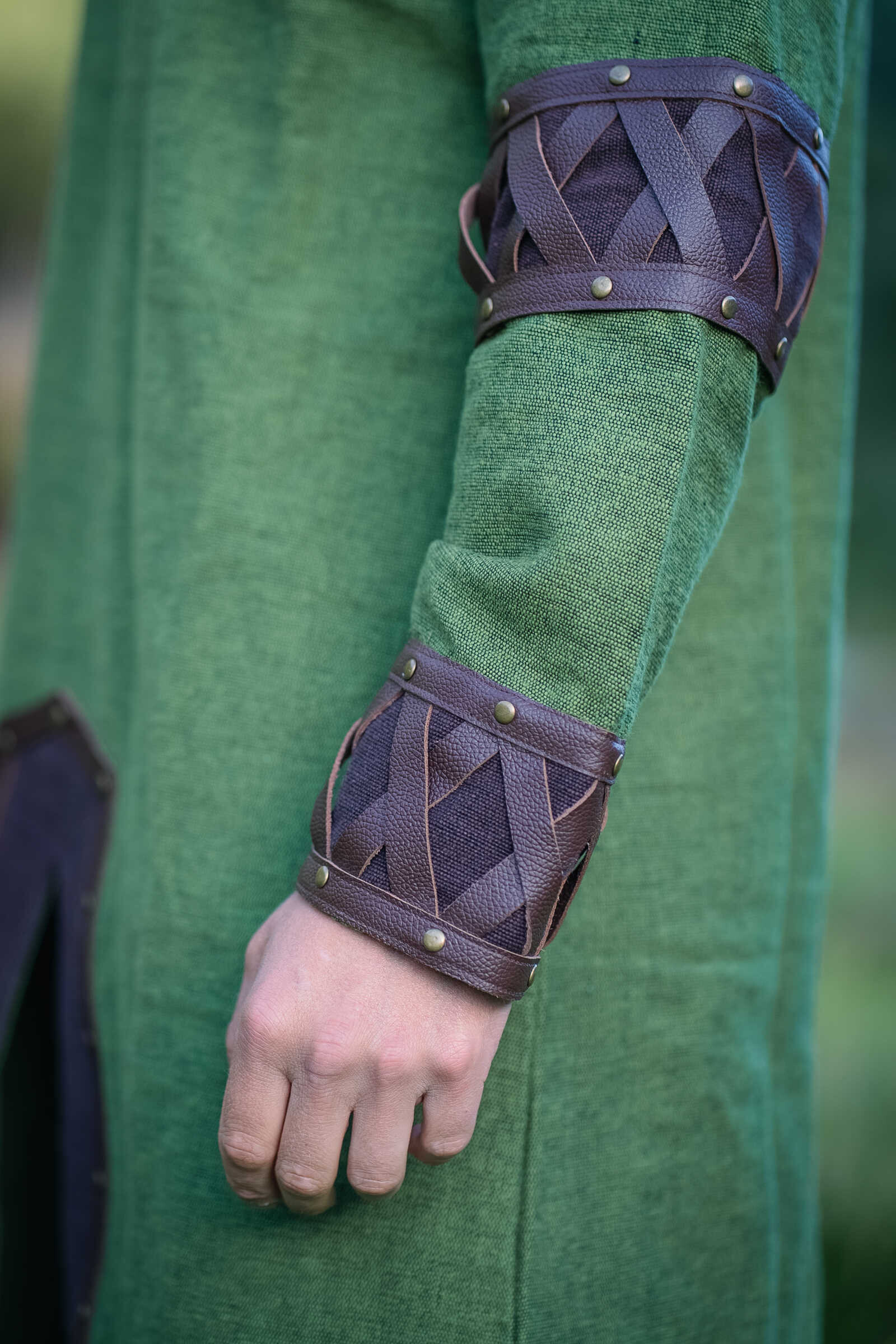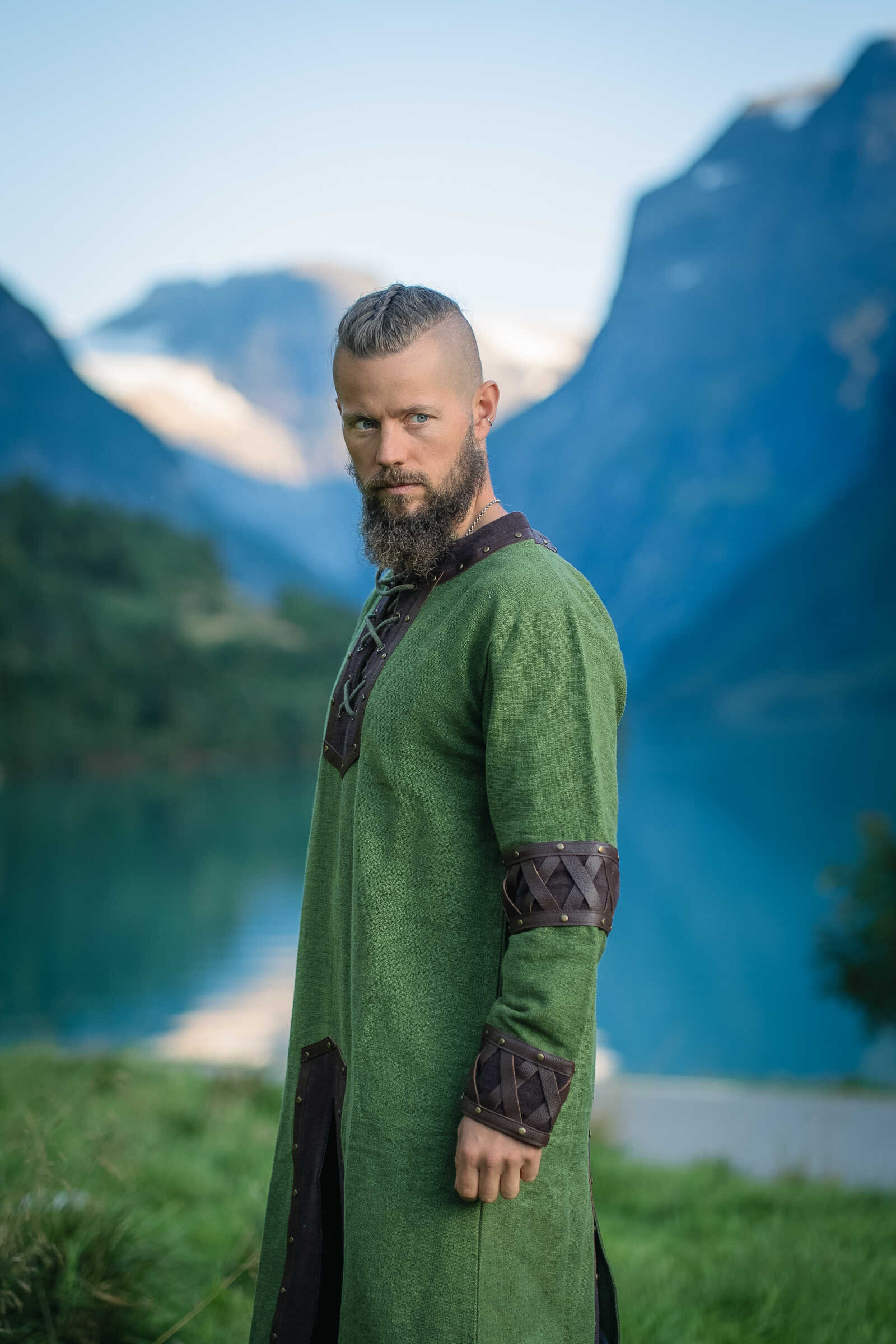 La Tunika vichinga modello Leif, verde con dettagli in pelle genuina trasforma l'abbigliamento in esperienza: le applicazioni in vera pelle danno un aspetto autentico e resistente, mentre i lacci e gli occhielli offrono una vestibilità personalizzata che rende facile indossarla e muoversi con agilità. I rinforzi ai polsi e ai gomiti aggiungono la giusta durabilità dove più serve, affinché l'indumento mantenga il suo aspetto anche dopo molte avventure.