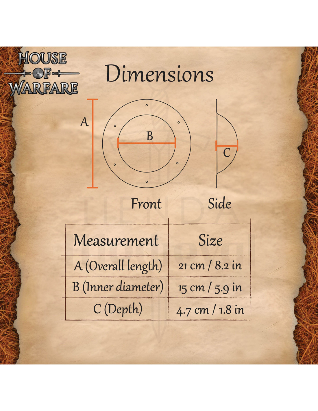 Montarlo è semplice e sicuro grazie ai fori preforati e ai rivetti inclusi, così guadagnerai tempo nell'assemblaggio e il pezzo sarà saldamente ancorato al legno. La sua forma bombata è progettata per deviare colpi, proteggendo la mano dal centro dello scudo e permettendoti di utilizzare il pezzo con scioltezza e controllo durante dimostrazioni o combattimenti sceneggiati.