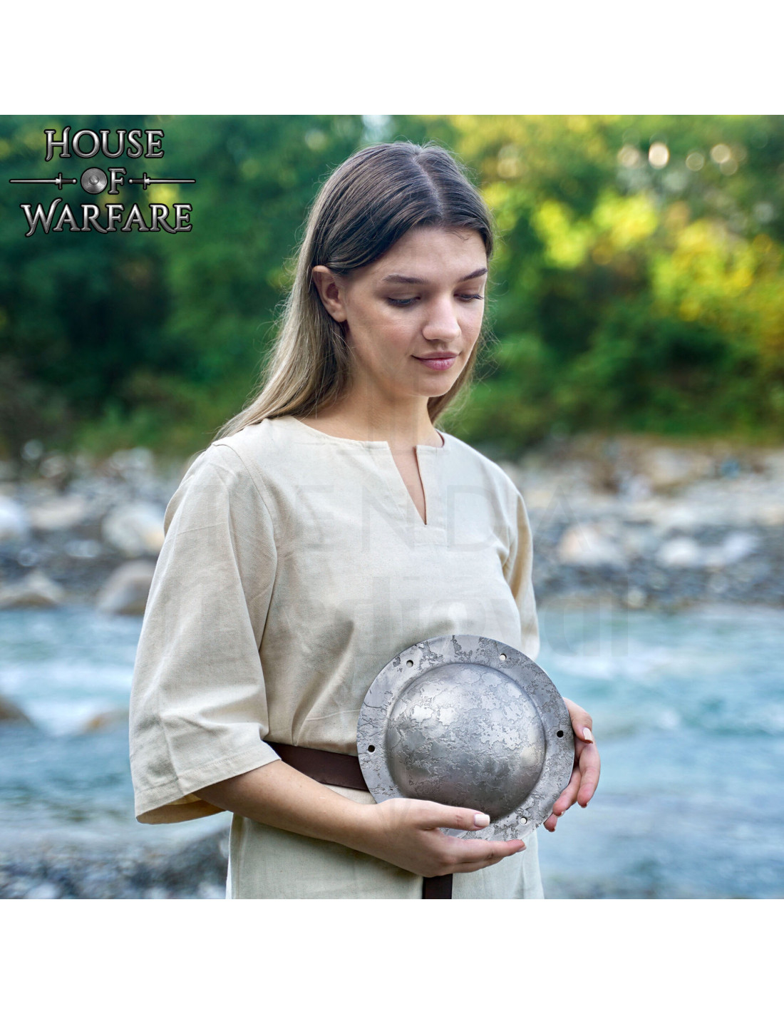 Visivamente, l'immagine mostra una superficie argentata con patina e macchie intenzionali, un bordo ampio con fori distribuiti uniformemente e la protuberanza centrale caratteristica che conferisce volume e presenza. Questo trattamento conferisce coerenza storica e un'estetica che si distingue sia in vetrine che nel campo di battaglia ricreato.