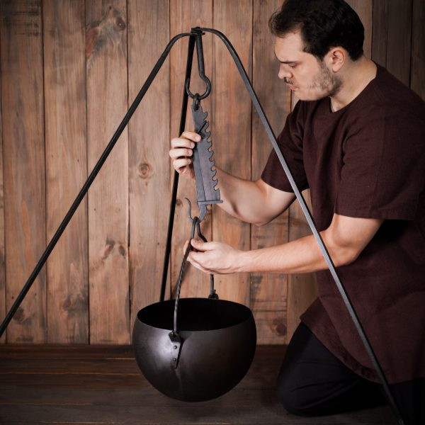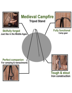 Il nostro grande treppiede assicura che la tua attrezzatura da cucina rimanga saldamente in posizione, all'altezza perfetta per un'esperienza culinaria senza problemi durante il campeggio nei boschi. Che tu stia costruendo un falò medievale o semplicemente godendoti un campeggio notturno, questo treppiede sarà il tuo compagno affidabile.