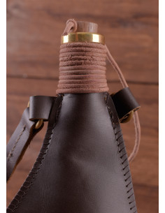 Le cuciture visibili nella parte inferiore sono una testimonianza della cura e dell'attenzione ai dettagli nella sua fabbricazione, mentre il elegante collo in ottone lucidato non è solo attraente, ma facilita il riempimento e l'accesso alla tua bevanda. Inoltre, le cinghie in pelle permettono di portarla appesa, rendendola facile da trasportare e sempre a portata di mano.