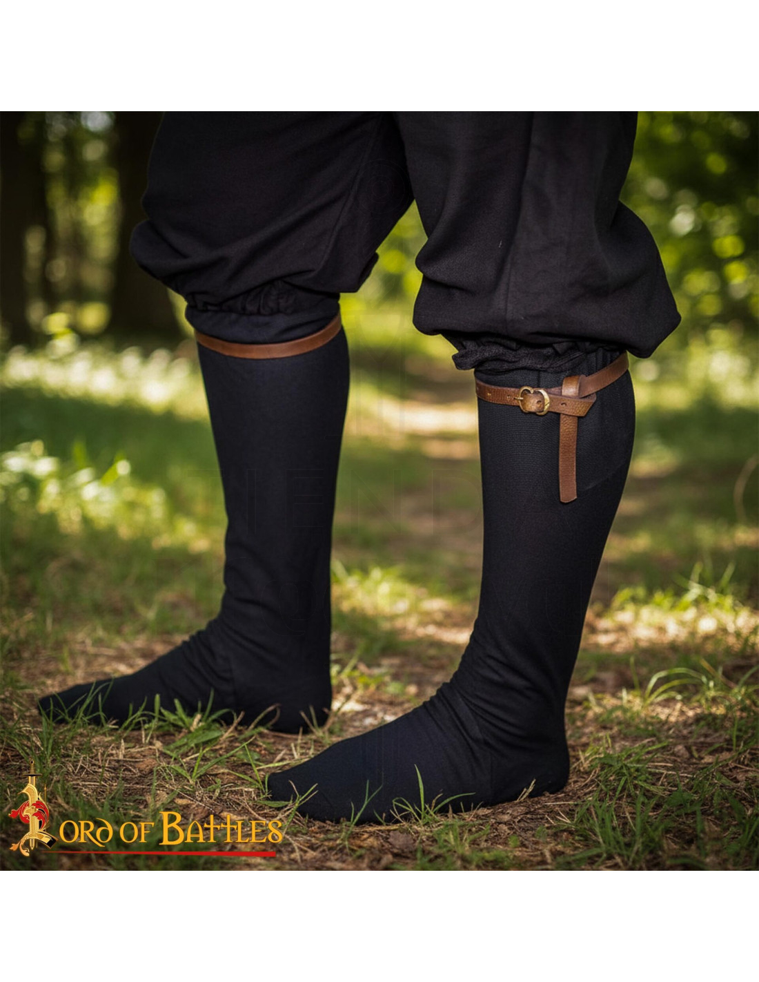 Progettate per adattarsi facilmente, le cinghie mostrano vari fori che consentono una regolazione sicura e personalizzata, adattandosi al movimento e garantendo che il capo rimanga al suo posto durante le giornate di fiera o lunghe giornate di rievocazione. Le fibbie metalliche dorate, con una leggera ondulazione decorativa e chiusura classica, offrono un fermo solido, comodo e caratteristico, aggiungendo quel richiamo rustico che completa qualsiasi outfit ispirato al Medioevo.