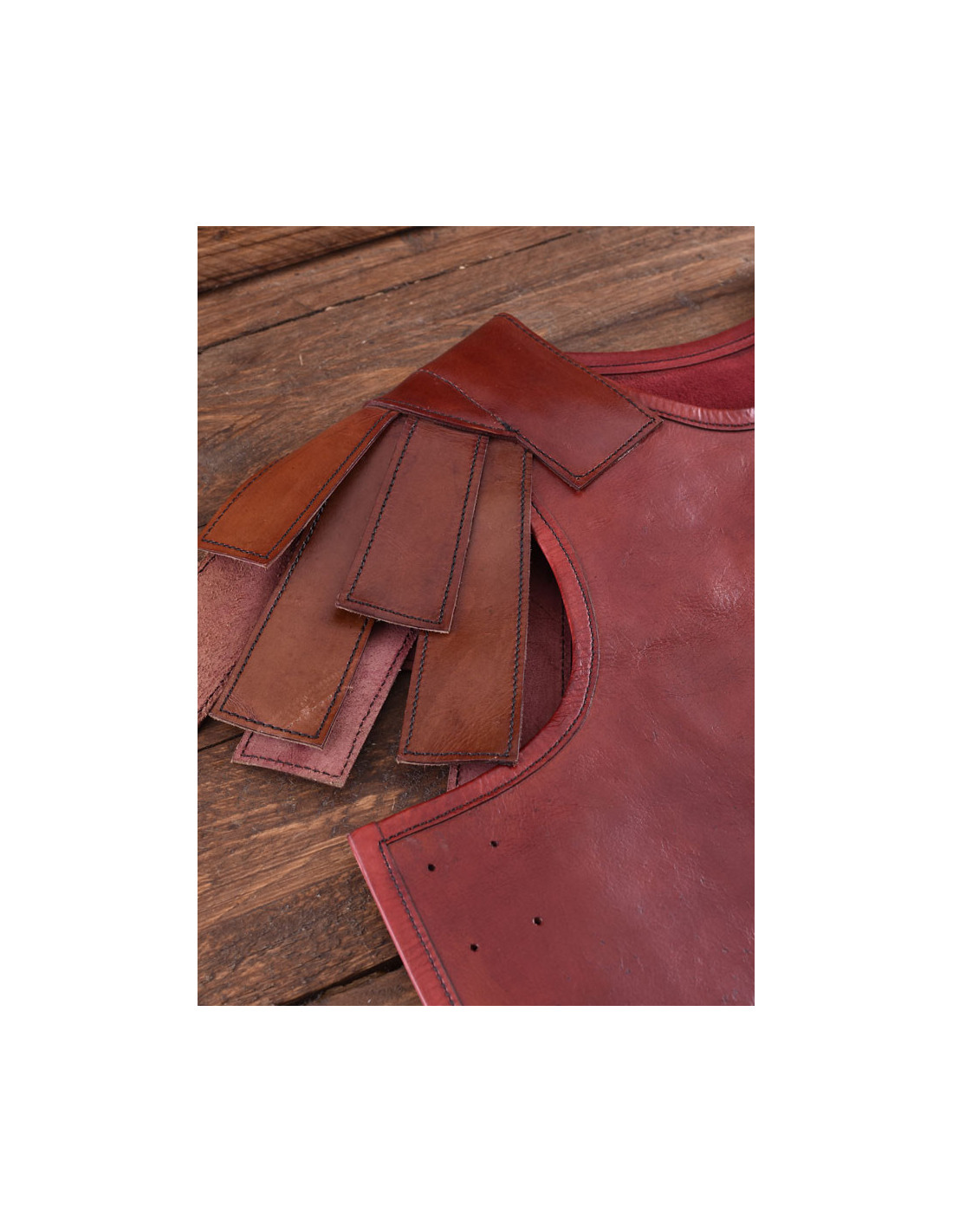 Realizzata in cuoio tinto con conciatura vegetale marrone-rossastro di spessore 2-3 mm, questa Subarmalia combina resistenza e flessibilità. La sua struttura durevole garantisce una lunga durata e una grande resistenza all'usura, mentre lo spessore ottimale ti fornisce la protezione di cui hai bisogno senza sentirti limitato nei movimenti.