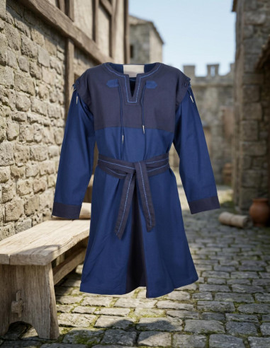 Scopri il tabarro medievale modello Clement bicolore, un autentico gioiello per gli amanti della storia e della fantasia. Disponibile in un'elegante colorazione blu mistico bordata di rosso imperatore, questo tabard ti riporterà indietro nel tempo e ti farà sentire un vero guerriero.