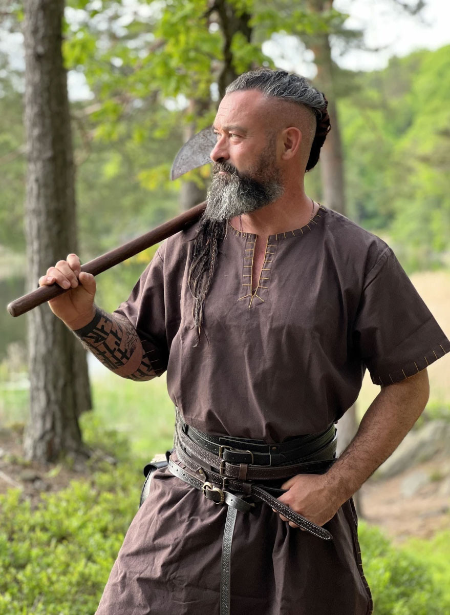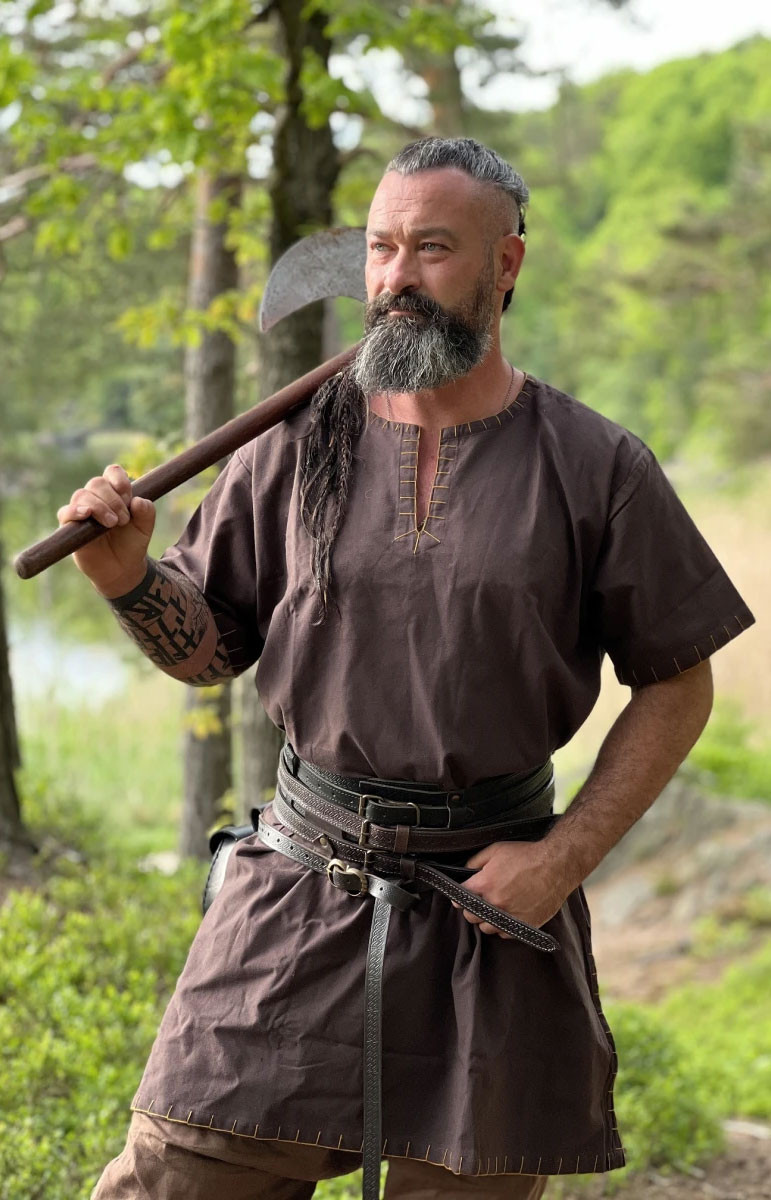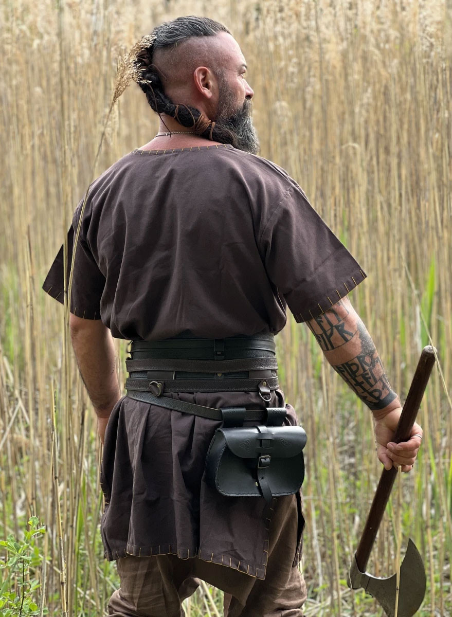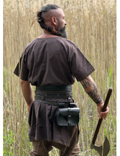 Tunica vichinga a maniche corte modello Theobald, un capo unico e originale che ti trasporterà nell'era vichinga. Il suo colore marrone scuro gli conferisce un tocco di autenticità ed eleganza. Questa tunica si distingue per i ricami sui bordi, che aggiungono un dettaglio particolare e distintivo.