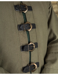 La tunica Oberon ha sei cinturini in pelle che la chiudono come un cappotto, rendendola facile da indossare e da togliere. Inoltre, il suo collo alto e le applicazioni sulle maniche gli conferiscono un carattere ufficiale e uniforme che ti farà sentire potente e maestoso, come se fossi un vero mago o chierico.