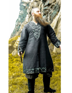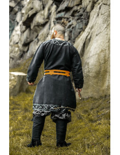 Fatti notare e distinguiti in ogni occasione con questa magnifica tunica Erik Viking, realizzata al 100% in cotone e impreziosita da applicazioni e rivetti in pelle. La cura nella progettazione e nella preparazione ne fanno un'autentica opera d'arte che vi trasporterà nell'affascinante mondo dei Vichinghi.