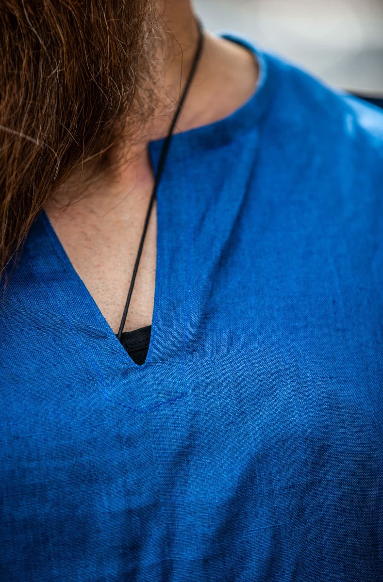 Questa tunica di lino blu è un capo versatile, perfetto per eventi LARP, mercati medievali e anche per completare un outfit nordico quotidiano. La sua semplicità ed eleganza senza tempo senza fronzoli o dettagli elaborati, ti permette di vivere il mondo vichingo in tutta comodità e senza rinunciare alla raffinatezza.
