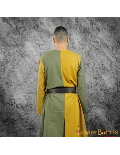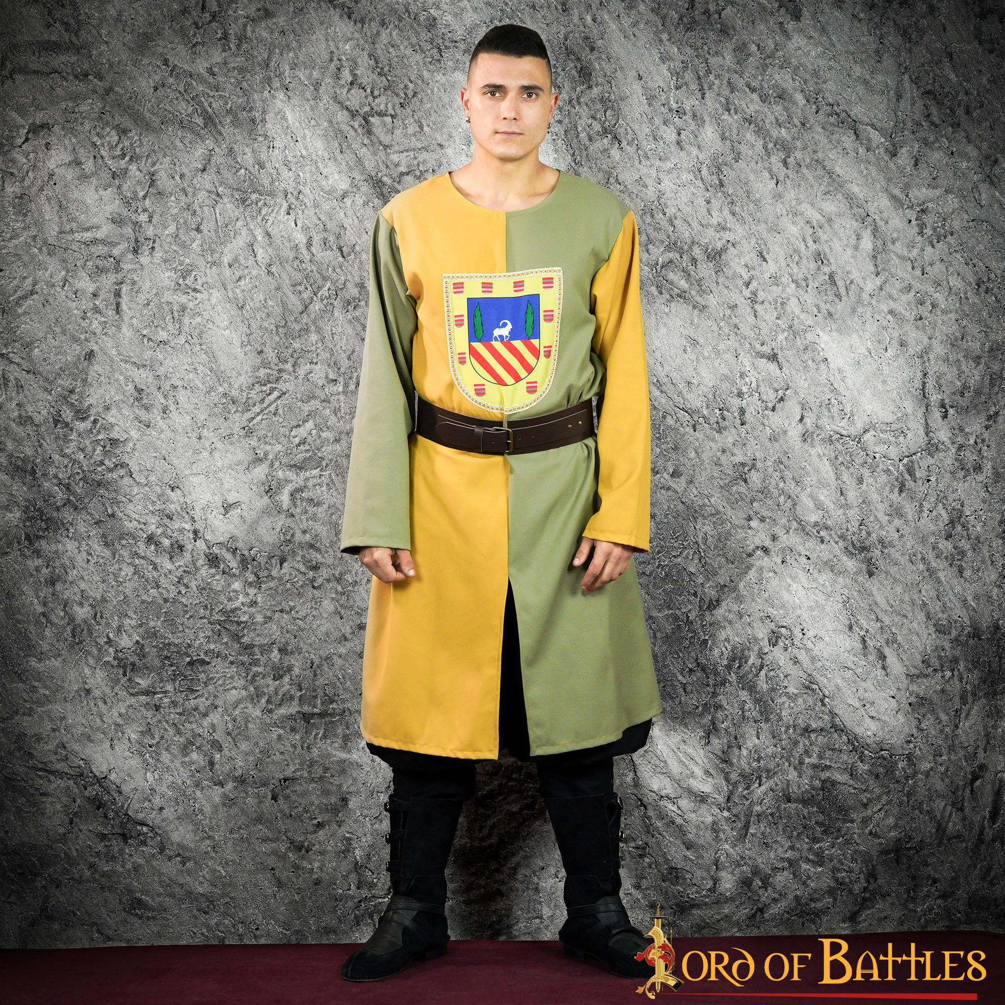 Tabardo medievale bicolore oliva-senape con scudo araldico