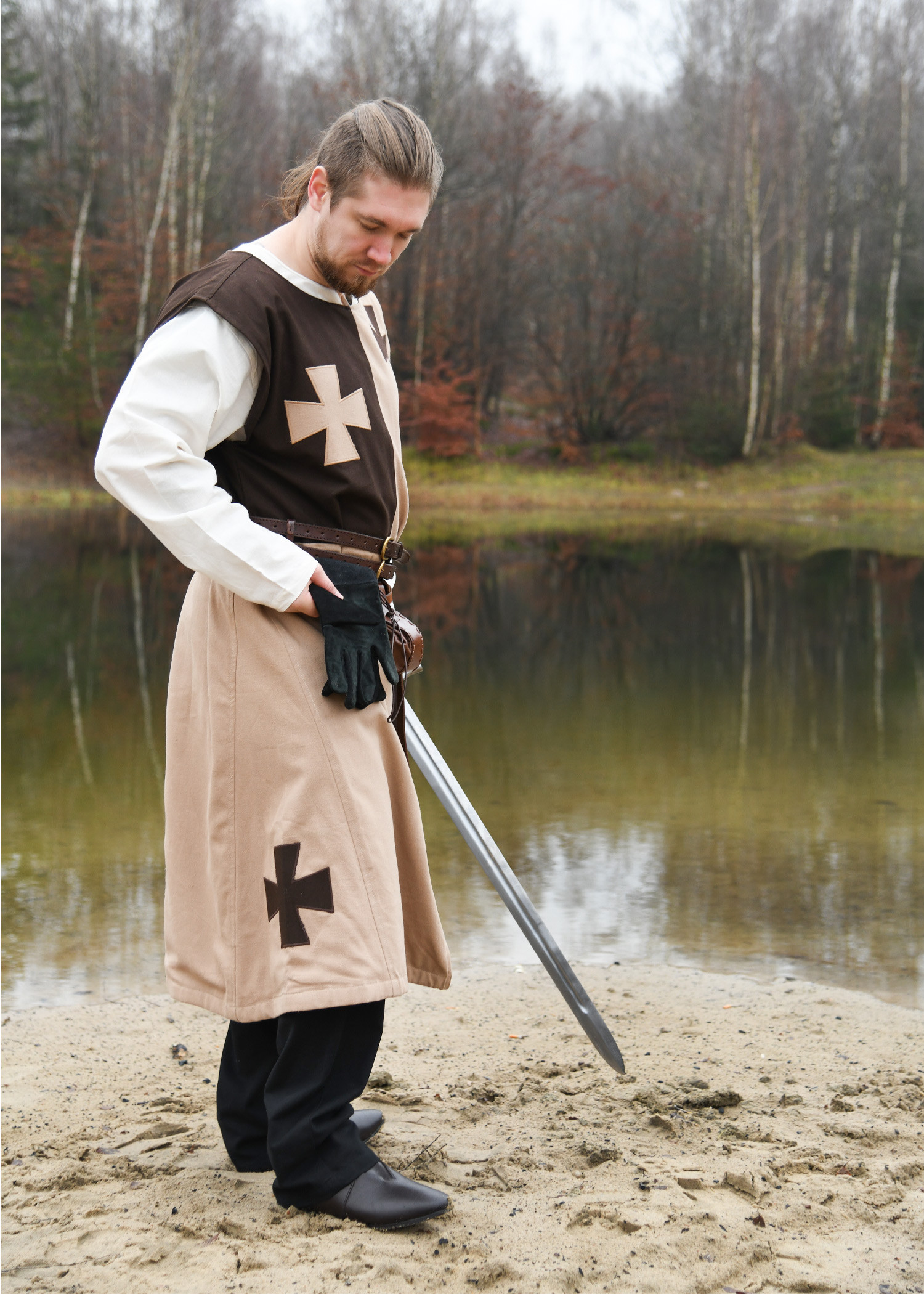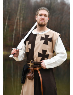 Tabardo medievale con croci templari in marrone