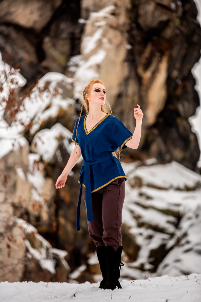 Immergiti nell'affascinante era vichinga con la nostra tunica vichinga da donna, il modello Matilda in blu! Realizzata in puro cotone al 100%, questa tunica garantisce non solo un'esperienza di indossamento confortevole ma anche una durata eccezionale che durerà nel tempo.