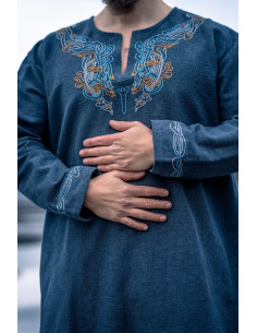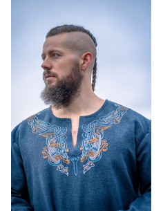 Tunica vichinga di Snorri con ricamo a mano in stile Urnes, grigio-blu