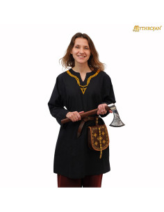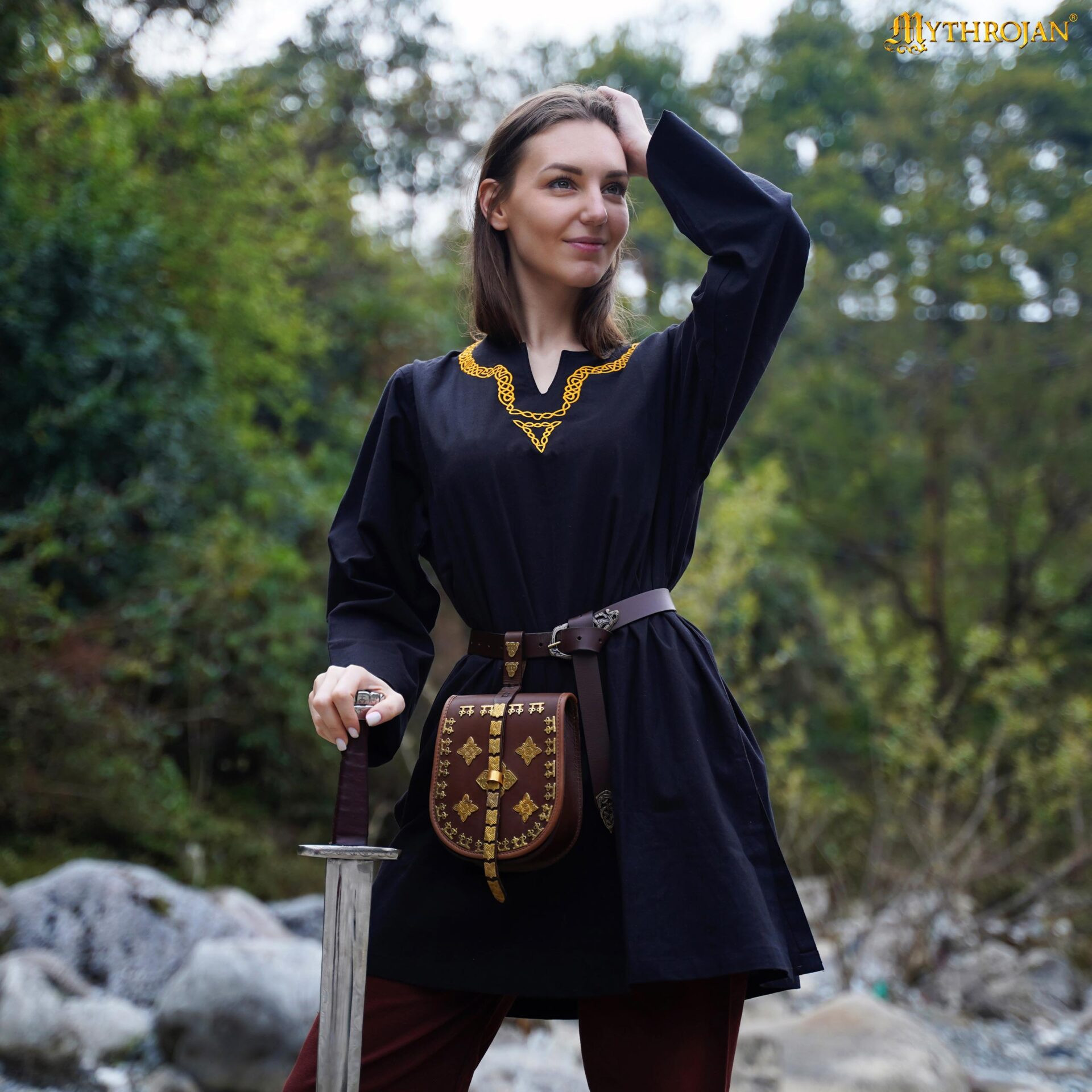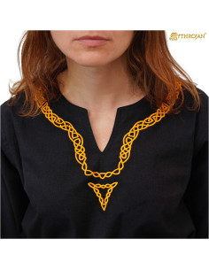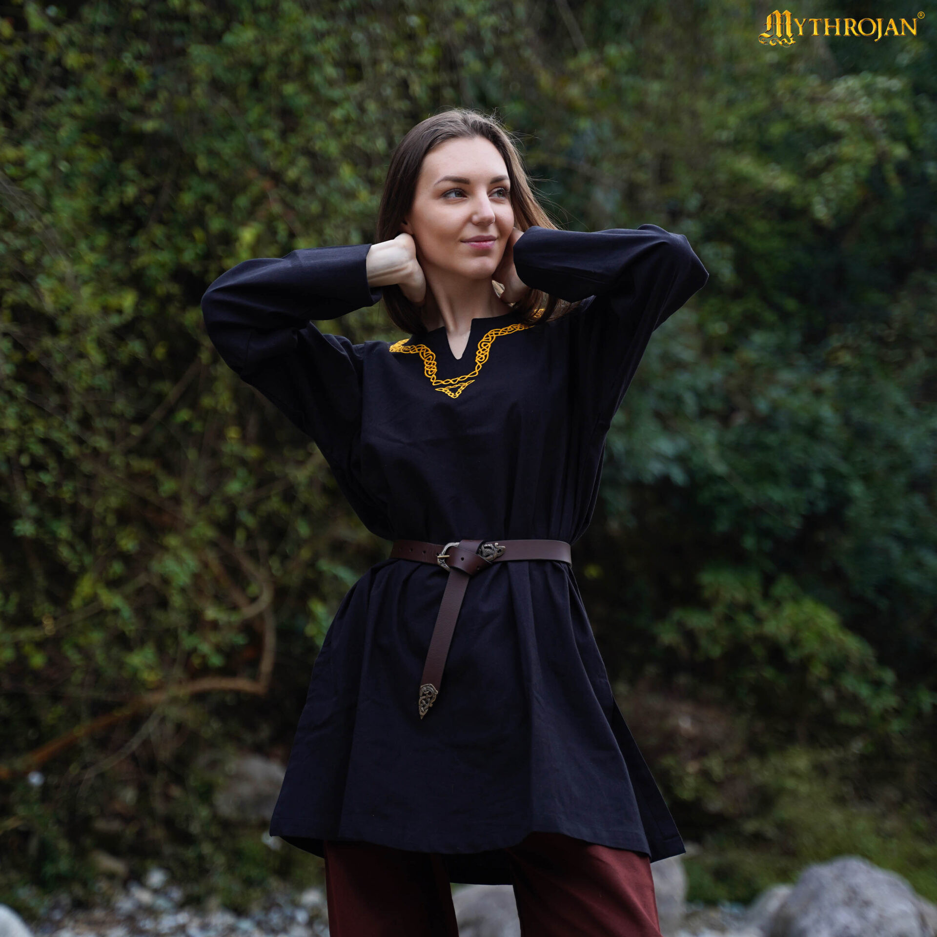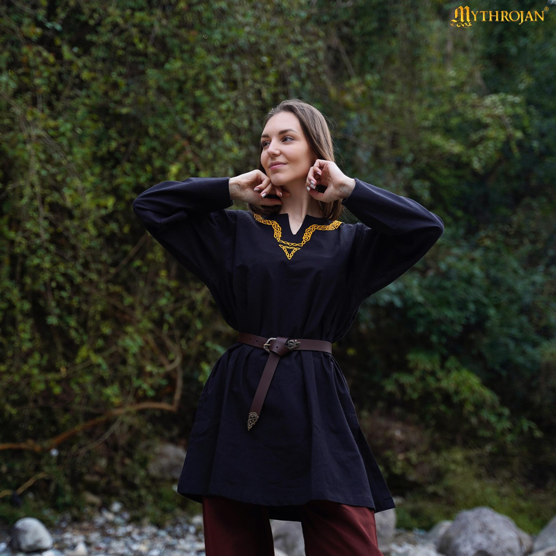 Tunika medievale in cotone con collo ricamato a maniche lunghe