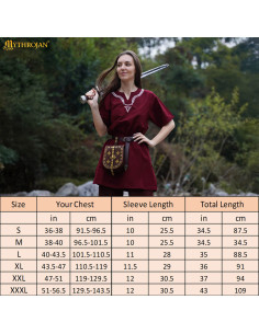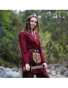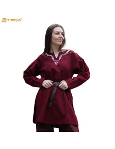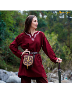 Il suo collo ricamato con motivi di nodi richiama direttamente le tecniche tessili del Medioevo e dell'Era Vichinga, aggiungendo un tocco di autenticità ed eleganza. Disponibile in bordeaux, un colore che si abbina perfettamente a cinture, mantelli e pantaloni per creare un completo completo e convincente.