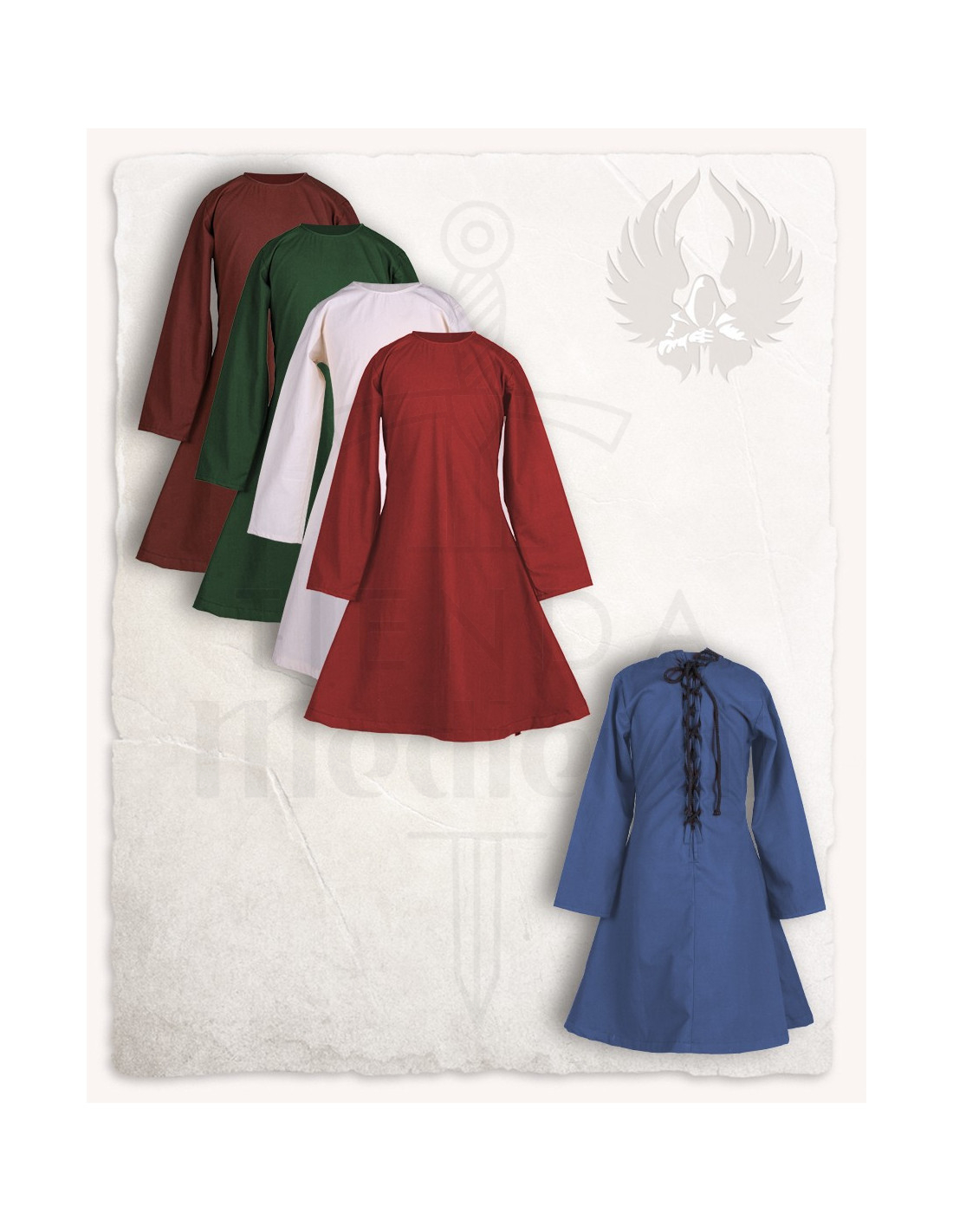 Parti per un viaggio nell'epoca medievale con il delizioso Abito medieval per ragazza modello Lisbeth, ora disponibile in un bellissimo colore blu. Questo abito semplice è progettato per ragazze e giovani donne, e presenta un'intrecciatura nella parte posteriore che aggiunge un tocco di autenticità.