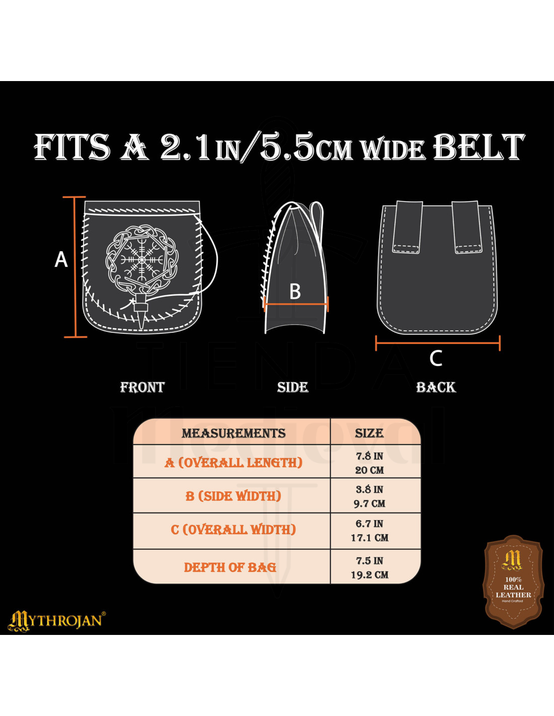 Il flap presenta in rilievo il leggendario simbolo Ægishjálmur, conosciuto come il Helm of Awe, simbolo nordico di protezione e coraggio, che aggiunge un tocco autentico e carico di significato al tuo equipaggiamento. La chiusura con un elemento che ricorda l'osso e la fascia di cuoio non solo garantiscono la sicurezza del contenuto, ma rafforzano anche l'estetica storica che cerchi in ricostruzioni ed eventi.