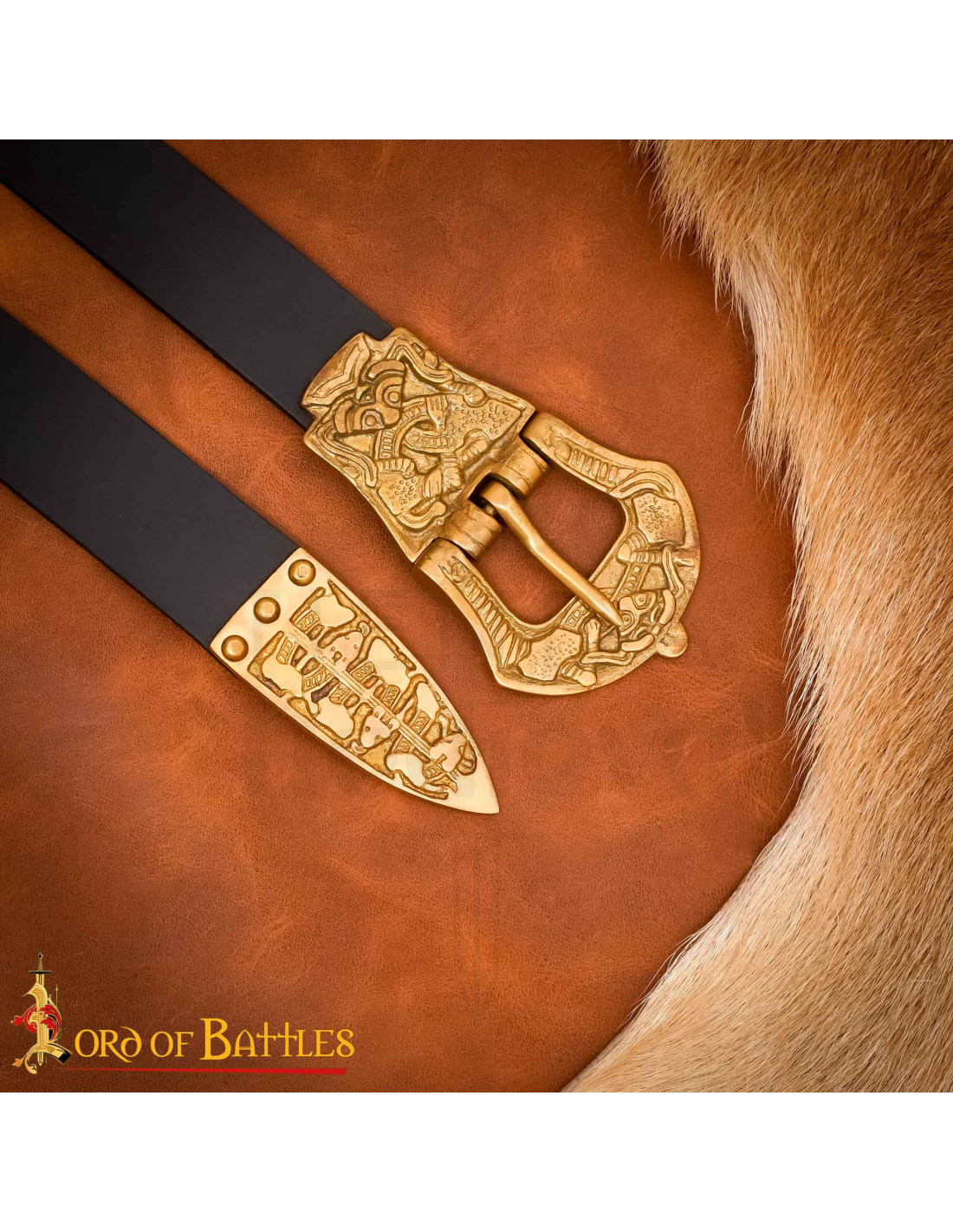 Cintura vichinga in pelle nera con fibbia e punta in ottone ornamentali