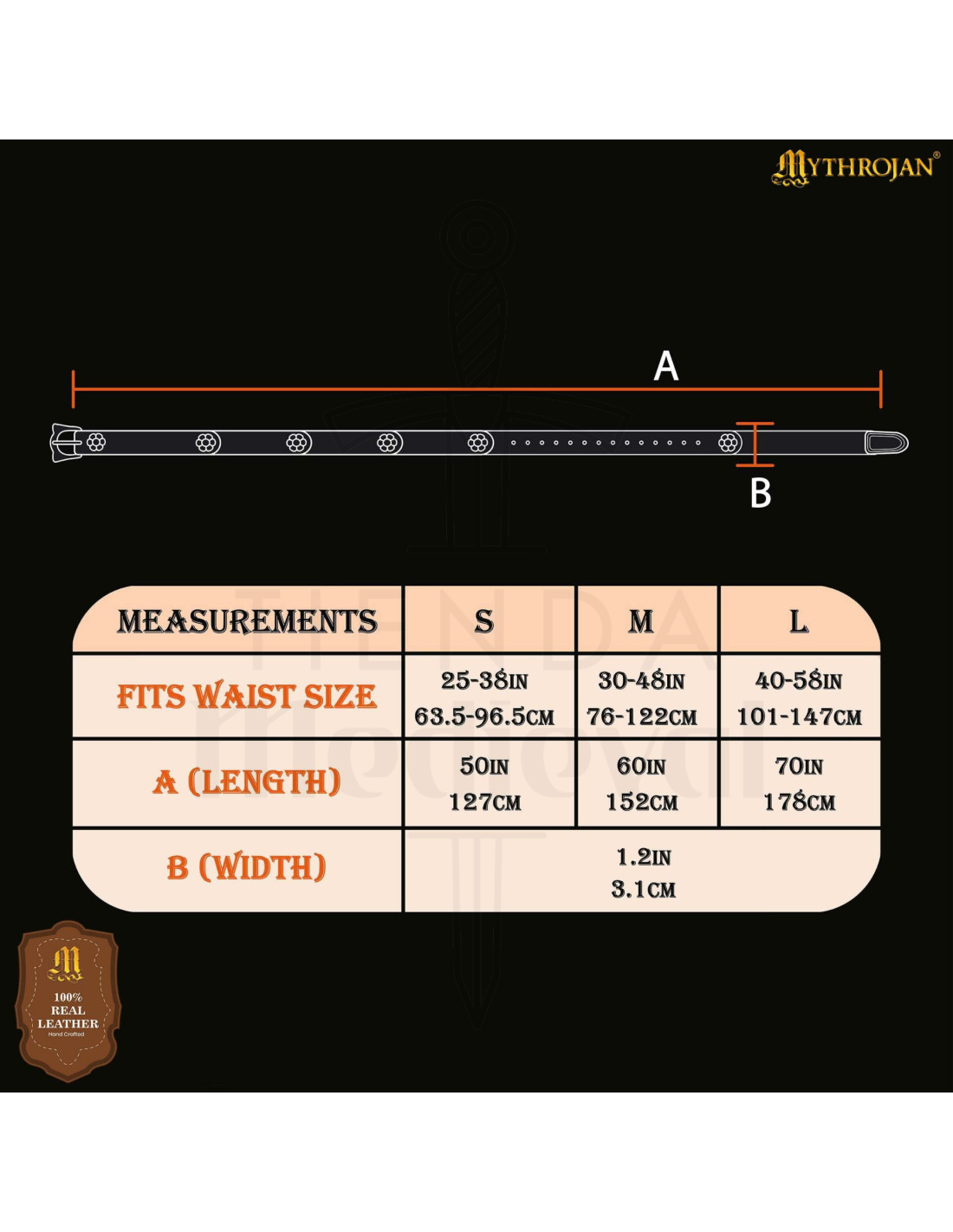 La cintura vichinga in pelle marrone, con fibbia e decorazioni in ottone, unisce una finitura scura che evoca pelle autentica, con una fibbia e particolari in tono dorato invecchiato che catturano l'attenzione. Gli ornamenti metallici con motivi floreali e medievali apportano un dettaglio artigianale, ideale per chi cerca un tocco storico senza rinunciare all'eleganza quotidiana. Il trattamento in rilievo sull'estremità offre quella finitura raffinata che fa sembrare il tutto pensato fino all'ultimo dettaglio.